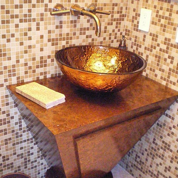 Custom Laminate Vanity in Powder Room, Glass Vessel Sink, Antique Brass Hardware, Mosaic Tile