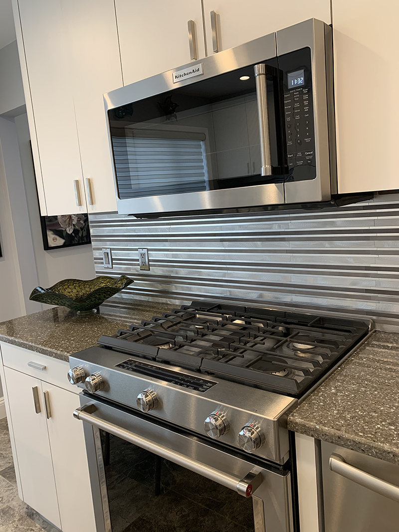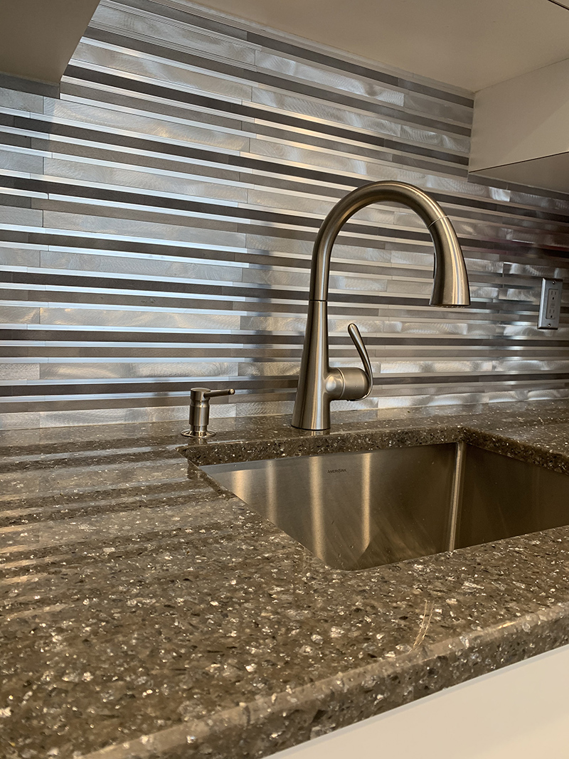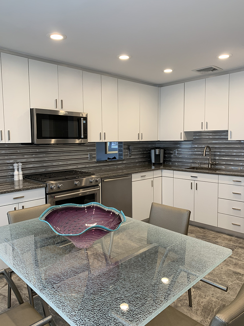 Quartz Countertop, Custom Crackled Glass Table, Dinette Chairs