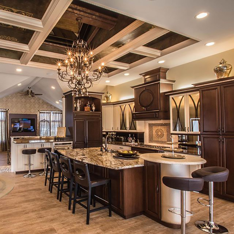 Vaulted Coffered Ceiling, Custom Cabinetry, Kitchen Island, Seating